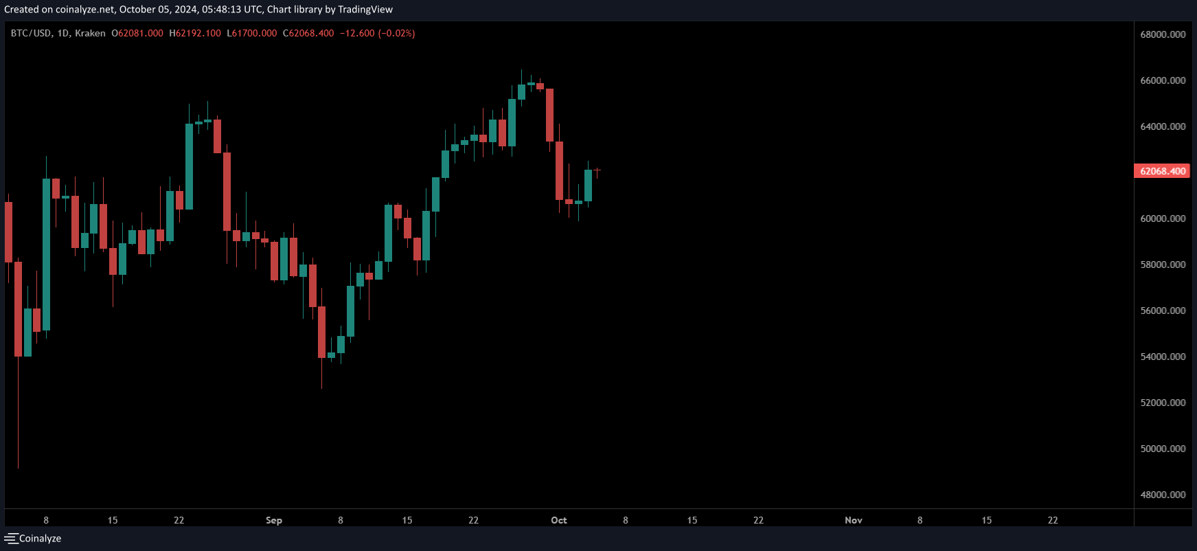 On the daily price chart , BTC’s weekly movement mirrored mid-August’s price action when a rejection near $65k halted a potential bull run.
